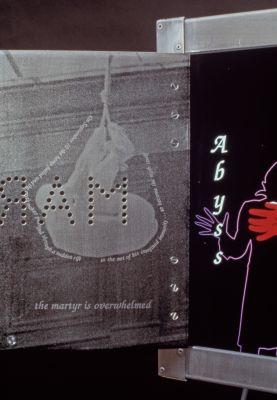 Martyr is an intricately layered, metal light-box sculpture by artist Jake Seniuk. It is part of his Ten Archetypes series that are conceptually inspired by the work of 20th century thinker Carl Jung. The lightbox features autobiographical text on the front. The lightbox doors swing open to display an illuminated red silhouette of a figure and the text "Abyss" and "Agape." Two images and related text are on the inside of the lightbox doors. The left photograph captures Yoshiyuku Takada, a Japanese dancer with the avant-garde dance group Sankai Juku, who fell five stories to his death on Sept. 10th, 1985 while performing a suspended dance piece. The right photograph depicts Raoul Wallenberg, a Swedish diplomat and humanitarian who saved thousands of Jews in Nazi-occupied Budapest, Hungary, and was arrested and imprisoned by the Soviet government in 1945.