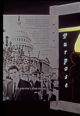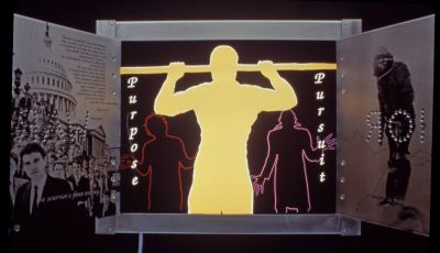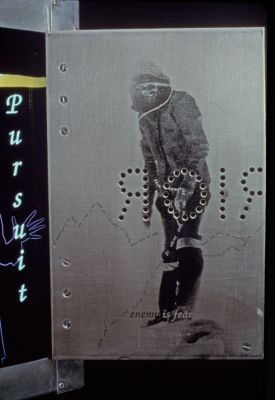 Warrior is an intricately layered, metal light-box sculpture by artist Jake Seniuk. It is part of his Ten Archetypes series that are conceptually inspired by the work of 20th century thinker Carl Jung. The lightbox features autobiographical text on the front. The lightbox doors swing open to display an illuminated yellow silhouette of a figure and the text "Purpose" and "Pursuit." On the inside of the lightbox doors, Seniuk features images and text related to green-party advocate Ralph Nader and Italian mountaineer and explorer Reinhold Messner. This artwork is part of Jake Seniuk's series of light-box sculptures created for the collection "Who We Are: Autobiographies in Art." The series was commissioned by the Washington State Arts Commission in partnership with the Office of the Superintendent of Public Instruction in 1990.
