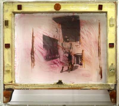 Stories from Caney Creek: Miss Mildred by Mildred Howard presents an altered photo of a woman. The photo has drawings and markings around it, and it is framed in a repurposed window frame accented by buttons and tiny perfume bottles. Howard combined found objects, salvaged windows, and family photographs to depict stories and memories. The artwork commemorates the people and places of her mother's childhood in rural Texas.