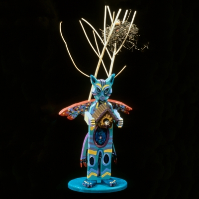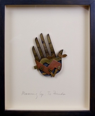 Artist Kiff Slemmons describes her work as dedicated to "the power of small." She explores identity and community in her mixed-media sculpture Measuring Up: To Friends. This artwork is part of a series of sculptures created in shape of a hand. Each one incorporates rulers and small found objects as symbols for growing up and being evaluated.