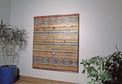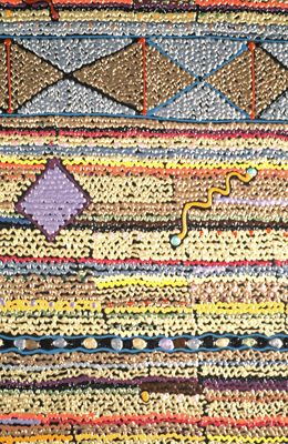 Pizarro's Folly by Alden Mason is a highly textured and patterned painting from his Squeeze Bottle series. During the 1980s, Mason mainly used squeeze bottles of acrylic paint to create his paintings. He liked working with squeeze bottles because the paint was like an extension of his arm. The bottles let him create long, fluid lines without having to stop to re-load paint onto a brush. Mason was known for experimenting, and he refused to use paint and paintbrushes in traditional ways. Mason's travels to Mexico and Central America influenced his imagery during the 1980s. His paintings often include designs and patterns that are similar to the intricate, geometric patterns of fabrics and rugs from those areas.
