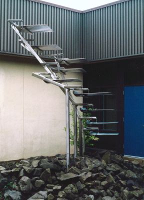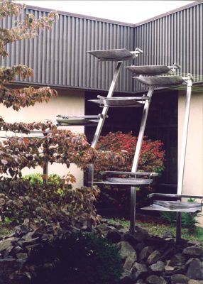Rain Dragon is an abstract, kinetic sculpture created by artist Roger Berry. It is comprised of a series of nine rain-collecting pans, which catch rain then tip forward to spill water in a cascading motion down the pans and rocks below.