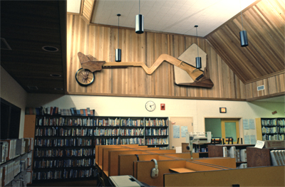 Rolling Wapatolian Finger Zither is a mixed media sculpture created by artist David Green for Wapato Elementary School. He conceived of this sculpture as a "fantasy musical instrument." The design, with a curved neck and a wheel at one end, whimsically expands on the form of a guitar.