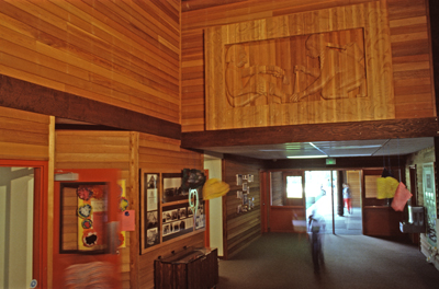 The relief design of this carved wood panel by artist Duane Pasco features two figures. Their clothing and other elements are based on traditional Native American Northwest Coast cultures but Pasco is a non-Native artist. The figures are also framed by patterns based on traditional Native American Northwest Coast curved and ovoid designs.