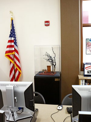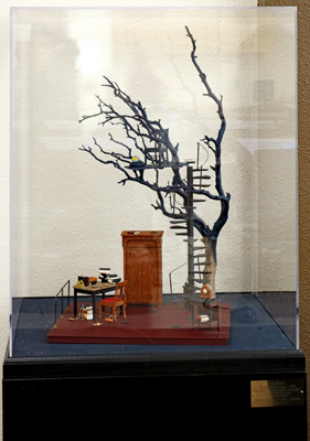 The Study is a mixed media sculpture created by artist Heather Ramsay. The diorama-like composition features miniature objects you might find in a library or study. She places these elements into a surreal context, with a spiral staircase circling a leafless tree.