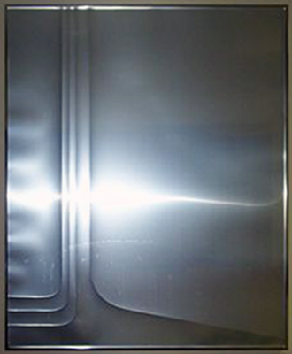 Untitled #5 is part of artist Valdis Zarins' series of embossed, aluminum lithography plates. The series look at how simple lines and angles create and define space and depth on a reflective surface. He noted, "The raised embossed lines are capable under appropriate lighting conditions of capturing the source of light(s) as a luminous 'aura' that moves along the embossed ridge as the viewer moves across the picture plane left to right, etc."