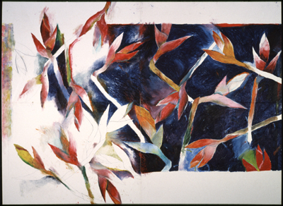 Due is an expressive painting by artist Virginia Paquette. It is part of a series of artworks begun while the artist lived in Rome, Italy. The series explores themes of movement and mystery. The artist notes that the title is the Italian word for two. She states that this represents "the yin/yang relationship of the universe: the light and the dark. The flower image, a natural and personal symbol, is also a strong abstract shape with tumbles and bumps across the surface, some falling out of the plane which moves from light to dark (or day to night) floating in an out, closed and open spaces."