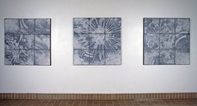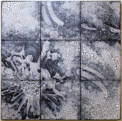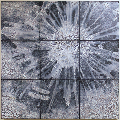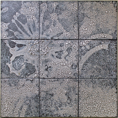 Artist Robert Sperry created this mural of ceramic tiles for Mullin Road Elementary School. He glazed the tiles in black before their first firing. He then added a white, glass-like, liquefied clay (a "vitreous slip") to create the crackled, textured surface during the second firing. Sperry is known for his ceramics' complex surfaces that are created with layers of glazes and slips.