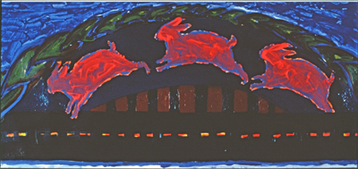 Oregon Grapes is a cheerful, colorful painting by artist Melissa Madsen. She embellished the dress worn by the bear figure using glass beads. She notes, "I use my experiences in the outdoors to give me my themes and story lines… I consider my paintings to be narrative and whimsical. I approach my work in a light-hearted way in an effort to project he joy one can feel when actively participating in an environment that is not destroyed."