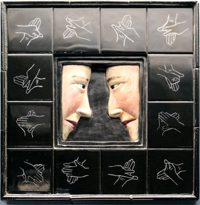In Rock, Paper, Scissors, artist Anne Storrs explores her interest in images of hands. She created this tile sculpture in reference to the communication and conflict present in the simple children's game.
