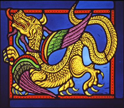 Animals of the Chinese Zodiac: Year of the Dragon is part of artist Cappy Thompson's series of "grisaille" stained glass windows based on Chinese mythology.