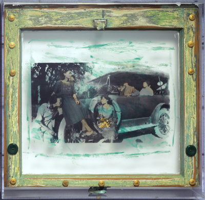 To create her vivid and detailed scenes, Thompson often uses a glass painting technique called "grisaille" where black line drawings are painted on glass, which is then fired in a kiln to make the line drawings permanent. Grisaille has existed since medieval times (approximately 450-1450) and is what you often see in stained glass windows in European churches.