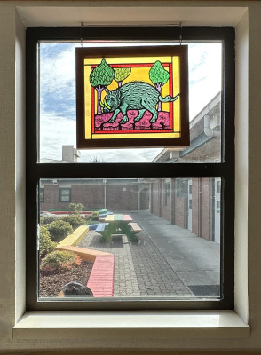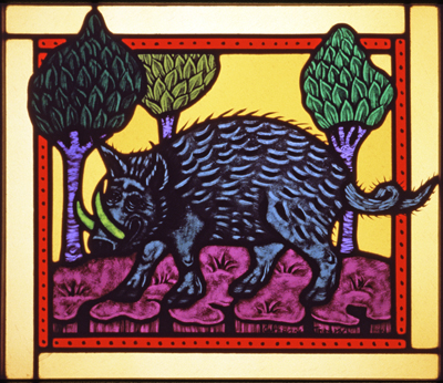 Animals of the Chinese Zodiac: Year of the Boar is part of artist Cappy Thompson's series of "grisaille" stained glass windows based on Chinese mythology.
