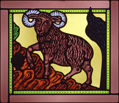 Animals of the Chinese Zodiac: Year of the Ram is part of artist Cappy Thompson's series of "grisaille" stained glass windows based on Chinese mythology.