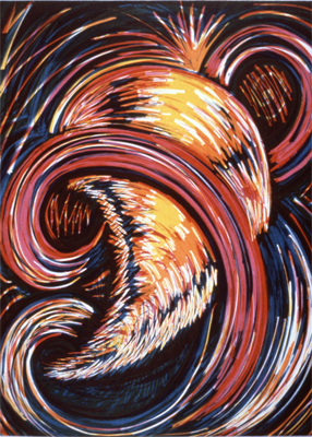 Artist Barbara Eiswerth's monotype print Tempest #1 is part of a series of prints that focuses on how we mistreat our natural forests and lands. Eiswerth notes, "I always deal with the land, not necessarily landscape... I was intrigued by the intense, violent wind and especially when the weather was accompanied by rain, hail, or snow." She created this series during an artist residency at the Ucross Foundation in Wyoming. Monotypes are unique prints created by painting with inks directly onto the printing plate. Eiswerth noted that "It is the most spontaneous of any printmaking form, this is why I like it... This process is extremely challenging and equally rewarding: when you pull a perfect print."