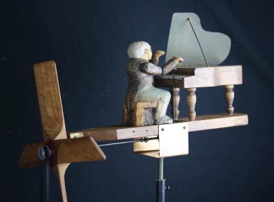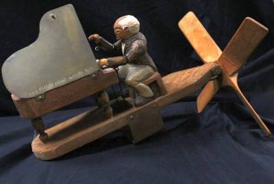 Man Playing Piano II is part of artist Victor Moore's series of whimsical whirligigs. These charming, hand-carved, kinetic sculptures explore the humor and humanity in our everyday movements. They spin and come alive with the help of an electric motor.