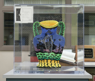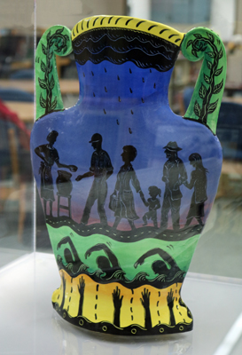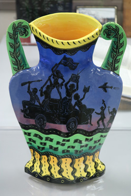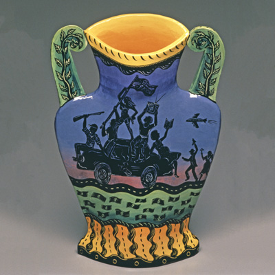 Liberties Leading The People is a painted ceramic vase created by artist Joellyn Rock. The imagery and title reference a painting by the French artist Eugene Delacroix (1798-1863) about the French Revolution (1789-1799). Joellyn Rock notes that in the painting, “a female figure symbolizes ‘liberty’ which the French people rise up to follow.” Her vase plays with this theme and applies it to modern-day issues. She states, “On the front of the classical vessel form, liberties of speech, press, arms, religion, sexual expression and reproductive choice parade past. On the reverse side of the vessel, Freedom takes the form of a free lunch line, as one also has the liberty to fail in this sink or swim economy.”