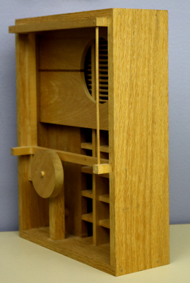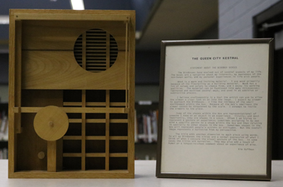 The Queen City Kestrel is part of artist Kim Hoffman's series of wooden sculptures called "Birdboxes." The sculpture is filled with different geometric shapes. The many layers of these elements invite the viewer to look closely. The artist notes, "The boxes are a narrative about my interests, my awareness of the non-human world, and my personal experiences in life with people… Often I am trying to represent a gesture or experience; sometimes assigning in my own mind a specific person to a shape within the box and then relating it spatially to other shapes in the box."