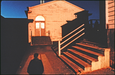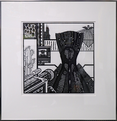 Artist Dennis Cunningham's surreal, graphic print Moral Tail comments on and references a specific type of evangelical television programming, in which the camera, speaker and audience are all in view simultaneously. Visible in the piece are several Christian symbols, including the tail of a fish, a cathedral, and an abstracted bird.