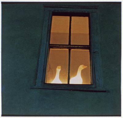 Two Yellow Geese is a photograph captured by artist Adrienne Salinger while travelling in New Mexico. She notes, "I was walking at night through the streets of Santa Fe and I saw the geese on the third floor of an apartment building. I thought they looked so majestic and humorous glowing in the darkness that I made the photograph. Because the only available light came from a street lamp nearby, the exposure was a full minute."