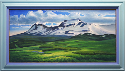 Artist Bob Leader painted The Summit after hiking in Glacier National Park, Montana, in early summer. He notes, "This section of the range of mountains depicted has an awesome quality which I hoped the viewer of this painting can share with me. As the clouds move, the shadows and lights constantly shift, yet the massive forms of the mountains are stoically fixed, rooted in the millions of millennia, which have given them existence."