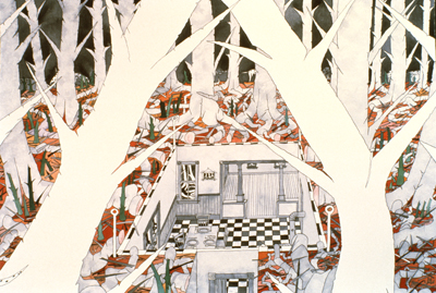 Test Pit II is part of artist Madge Gleeson’s series of imaginative landscapes. In this piece, she places the rooms of a house as if part of the forest floor. These works use archaeological themes to play with the tension between fantasy and reality. She notes that the imagery suggests the feeling of “searching for meanings which are hidden through time and circumstance.”