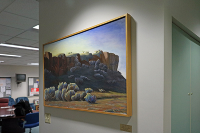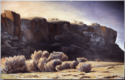 Cliff and Bushes near Moses Lake was painted by artist Anne Fiske after sketching on site in the Scablands of Eastern Washington. This unique landscape is characterized by tall cliffs and exposed bedrock, formed by a mega-flood that occurred during the last ice age.