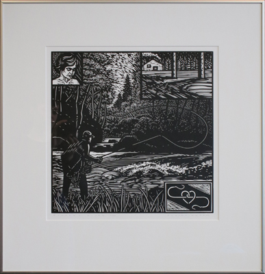 Duncan's River is a print created by artist Dennis Cunningham. He created the composition by cutting the negative space out of a linoleum block. He then layered ink onto the areas of linoleum that remained and transferred the image to paper. It is part of a body of prints created by the artist to celebrate fishing, and fish as a symbol of nature. In these prints, he often layers inserted images to support the artwork's story and concept. He states, "My use of multiple images is an attempt to visually describe the character of real experience. Like memories, the images are layered and juxtaposed. Together they give a more complete impression of experience than a single image can provide."