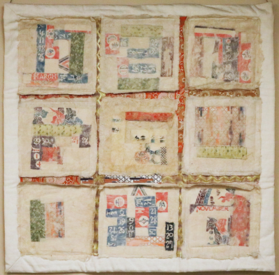 Japanese Silk Calendar Quilt was conceived of after artist Sara Gilfert visited Japan, and was made by combining textiles and materials found during her travels with handmade "washi" paper elements.