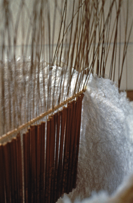 The Proper Rules of Conduct is a mixed-media sculpture created by artist Mary McIntyre. Each different material holds a humorous and symbolic meaning. She created the vessel form using dried cow gut to represent "hide-bound tradition," or the unwillingness to change because of tradition. She lined the interior with silk, as a precious material. Chopsticks hang in a straight line within the vessel, and represent rules. Reeds surround the top of the vessel, protecting what is inside. She notes, "If the piece is moved, the chopsticks make a slight noise when disturbed much as those who adhere to rules complain when rules are disturbed."