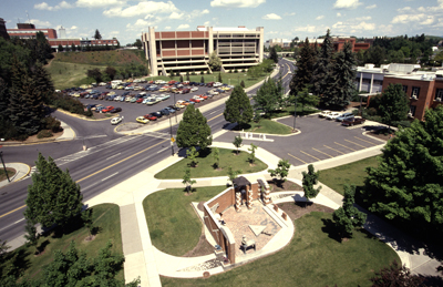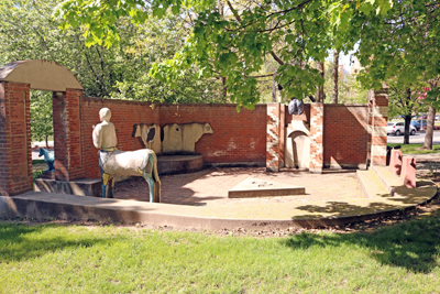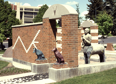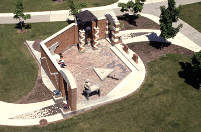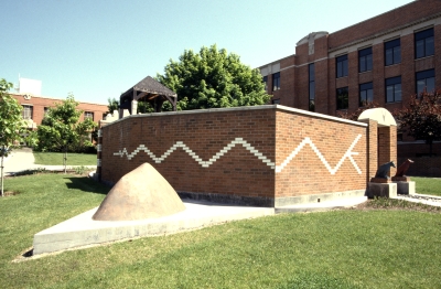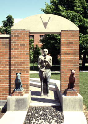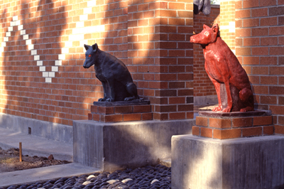 Cobumora is a sculptural plaza created by artist Andrew Leicester for Washington State University. A site-specific installation, its imagery and themes relates to the disciplines of veterinary medicine and pharmacology taught in the adjacent buildings. It features a brick courtyard with arched pillars and multiple symbolic statues of animal figures. The title is a portmanteau word that combines Cow, Bull, Mouse, and Rat. The imagery references many different healing myths and rituals from ancient Egypt, Greece, and Mesopotamia. Viewed from above, the courtyard suggests a bull’s skull. Pillars are inscribed with pharmaceutical symbols. Two halves of a cow forms a bench. Chiron the centaur, known in Greek myth for his skill in medicine, holds two snakes. The snakes reference the Staff of Asclepius, the ancient Greek symbol for medicine. Two black cats guard one entrance, topped by five rats. The entrance is paved with stones that resemble mice. Tiles feature impressions of tools and bones. A horse figure represents medieval (450-1450) German methods of administering medicine. Two dogs designed in an ancient Syrian style guard the west entrance.