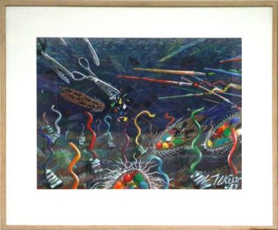 Artozoic Ocean by Carl Chew is a two-part artwork that includes a painting of an underwater scene and a story. This part presents the story in the form of a school test about the painting. The photocopied test sheet asks for "appropriate names" of the primitive ocean organisms and for an essay on the topic of "If it were possible to simply make all of this nonsense up, how do you suppose it was done?" Chew enjoys pushing the boundaries of fiction and non-fiction, and he has written obvious and absurd answers. He finds "vicious scissors" and "creatures from Space Invaders" in the painting. In the essay, he writes that "it seems very unlikely that anyone would want to make up what we have learned this semester. Its complexity is too varied for any human to have concocted it, I think!” The title itself hints at a geologic era with the “zoic” word ending, but not one that comes from geology books.