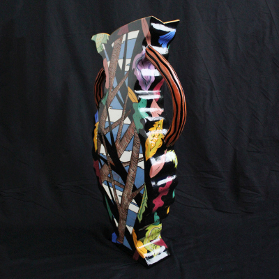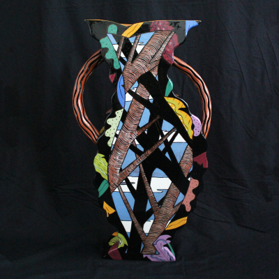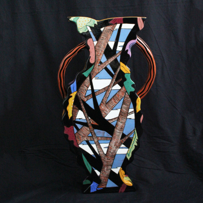 This vase by ceramic artist Carol Gouthro is an example of her hand-built terra cotta artworks that are formed and glazed with landscape imagery. With handles formed to resemble branches and overlapping, colorful leaves, this piece evokes the mood of an overgrown forest.