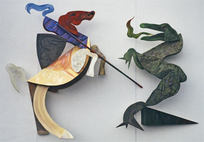 St. George and the Dragon is an example of artist Ron Hinson's three-dimensional paintings that explore color relationships, texture, surface, and form. The title and imagery in this artwork reference a myth that was represented in art of the European Renaissance (1400-1700). Hinson noted "Unlike most versions, this one is meant to convey a playful feeling and could be thought of as a parody of heroic conflict... One should notice the jaunty movements of the shapes... [and] the contrast of the light and bright colors of the left hand shapes as compared with the darker and more somber right hand colors."