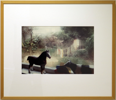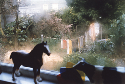 Cow & Horse/Backyard is a photograph by artist Ann Hughes. The composition plays with perspective, scale, and depth of field. A toy cow and horse appear blurry in the foreground with a wooded backyard visible through a fogged window in the background.