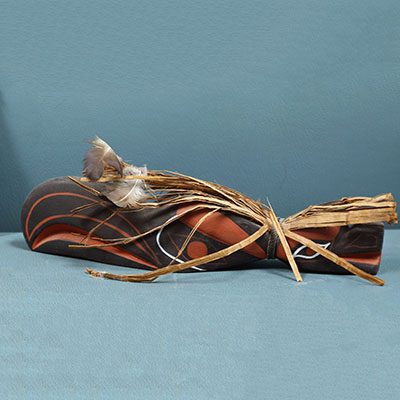 Bird Rattle is a hand-carved sculpture created by Makah artist Ben Della in the Coast Salish tradition in Neah Bay, Washington. He notes that his design is unique but based on old structures and methods of carving.