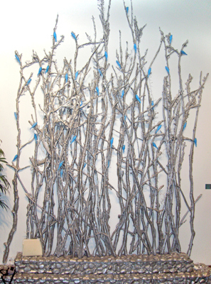 Mountain Home is a cast aluminum artwork created by artist Clarice Dreyer. The composition features clusters of branches with painted birds. The complexity and beauty of the natural world inspired the imagery. She notes, "Art and life are one. True beauty exists only in the everyday real world. It is about the common, ordinary, real person. I strive to touch the ordinary in my work through the use of imagery taken directly from our surrounding environment."