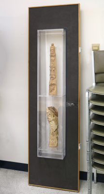Cousin Stick was hand-carved by Native American artist Ray A. Cheer in Omak, North Central Washington. Cheer notes that the imagery is inspired by his cousins and the design is influenced by historic carved masks.