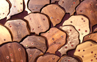 The Orchard is part of artist Jo Fyfe’s series of three painted sculptures commissioned for Cashmere High School. Each circular piece was constructed from various wooden, metal, and organic materials. The artworks depict significant events in Cashmere’s history. The Orchard depicts stylized fruit trees using different types of wood. This piece celebrates the fruit industry, and its importance to the region.