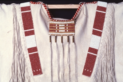 Cayuse and Nez Perce artist Maynard Lavadour created the hand-sewn and beaded Man's Ceremonial Shirt from three buckskin hides. The shirt was crafted after traditional ceremonial garments and is decorated with large pony beads, claws, teeth, bone, shells, and brass tacks given to the artist by his grandmother. The red geometric accents reference a color traditionally worn by men at times of war. This artwork is part of Beyond Blue Mountains, a collection that was curated by late Tlingit (Native Alaskan) artist Jim Schoppert. It presents the work of Native American artists of diverse heritage, ideas, materials, and styles. The collection takes an in-depth look at the artists’ unique voices and interpretations of tradition.