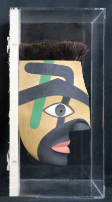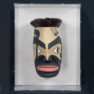 Friendship Mask was hand-carved by master carver George C. David as a contemporary interpretation of traditional Makah masks. These masks were historically worn by dancers who greeted canoes arriving at Neah Bay, before roads were developed and all visitors arrived by sea.