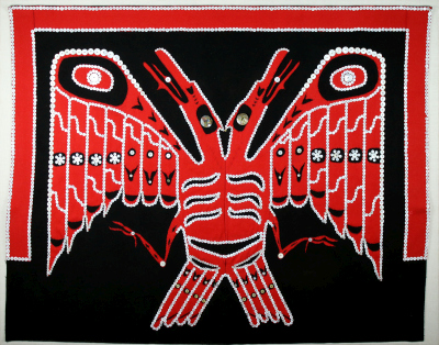 Ceremonial Crane Design is a hand-sewn button blanket created by Skokomish artist Andy Wilbur-Peterson. He notes that the crane is a significant symbol in Skokomish culture, and that the mother of pearl and abalone buttons used to create this artwork were gathered over time through trade. This artwork is part of Beyond Blue Mountains, a collection that was curated by late Tlingit (Native Alaskan) artist Jim Schoppert. It presents the work of Native American artists of diverse heritage, ideas, materials, and styles. The collection takes an in-depth look at the artists’ unique voices and interpretations of tradition.