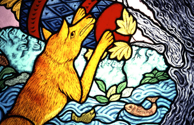 Artist Cappy Thompson's The Fox and the Drum is part of a series of stained glass windows that depict three Persian myths. These moral stories are hundreds of years old and are attributed to the Fables of Bidpai. In this window, we see a fox that has greedily pulled a drum down from a tree. In doing this, the fox has scared away the birds that were its actual prey. The fox has just discovered that the drum cannot be eaten, even though it is big and noisy.
