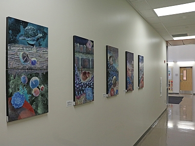Five Rides: Night Float is part of a five-panel mural by artist Peggy Hitchcock comprised of imaginary landscapes created from surprising combinations of microscopic and scientific imagery, surreal objects, and natural forms. Night Float features the night lights of a remote city, a radio, and two passing capsules whose imagery is derived from protozoa skeletons.