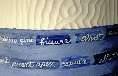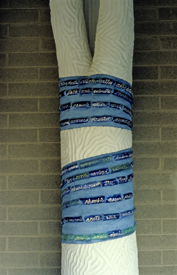 Artist Laura Sindell's sculpture Ghost Trees honors those removed to make way for construction. It suggests ideas about of regeneration, growth, and support. Repeated words wrap the trunks, calling to mind a memory song, but in this case, of biological terms.