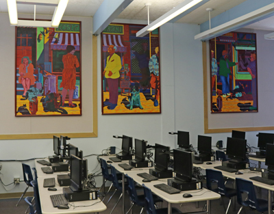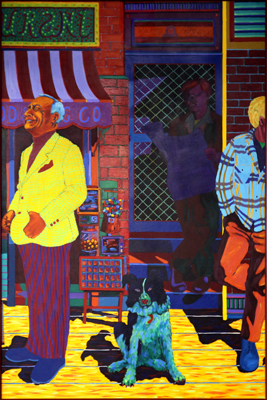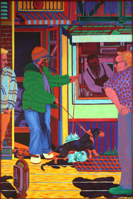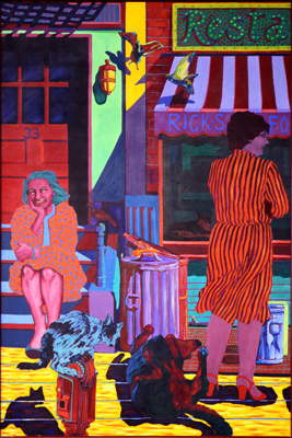 Painter Melinda Thorsnes created her triptych painting Rick's Seafood Restaurant using intense, saturated colors. The imagery explores community and relationships. Thorsnes states that the composition allows "each individual viewer the opportunity to become involved in the creative process by his or her own reaction to the work."