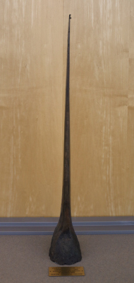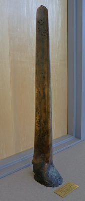 Native American artist Lawney Reyes (Sinixt, 1931-2022) created the abstract sculpture Clan Ancestor III in reference to traditional objects in his Sinixt culture of Central Washington. The artist notes, "my work is a conscious effort to progress from traditional achievements and to concentrate on continued development of detail and form so that it can be expressed ultimately in the most direct and abstract manner." This artwork is part of Beyond Blue Mountains, a collection that was curated by late Tlingit (Native Alaskan) artist Jim Schoppert. It presents the work of Native American artists of diverse heritage, ideas, materials, and styles. The collection takes an in-depth look at the artists’ unique voices and interpretations of tradition.