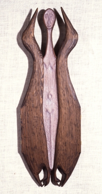 Loon People is a hand-carved sculpture by Native Alaskan artist John Hoover (Aleut, 1919-2011). Comprised of three panels of redcedar wood, the central figure is flanked by stylized loons and faces that represent different spirits. The imagery and symbolism are influenced by the mythology of the Northwest Coast.