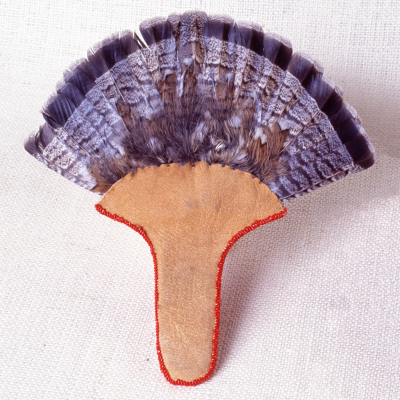 Red Design Dancing Fan was hand-crafted by Colville artist Debbie Finley in Spokane, Washington. The buckskin backing was tanned and stretched by the artist and the beads were chosen to create a tight and even design. This artwork is part of Beyond Blue Mountains, a collection that was curated by late Tlingit (Native Alaskan) artist Jim Schoppert. It presents the work of Native American artists of diverse heritage, ideas, materials, and styles. The collection takes an in-depth look at the artists’ unique voices and interpretations of tradition.