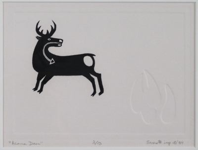 Acoma Deer is a subtle and graphic embossed print, created by Seneca artist Carol Snow in Spokane, Washington. This artwork is part of Beyond Blue Mountains, a collection that was curated by late Tlingit (Native Alaskan) artist Jim Schoppert. It presents the work of Native American artists of diverse heritage, ideas, materials, and styles. The collection takes an in-depth look at the artists’ unique voices and interpretations of tradition.